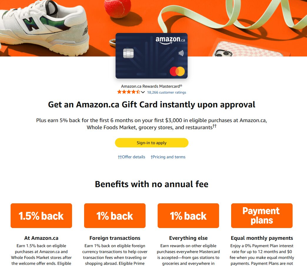 最後はすぐにお得というわけにはいかないのですが、Amazon.ca のマスターカードを紹介します。年会費は無料で、ウェルカムオファー終了後、Amazon.caとWhole Foods Marketで対象の買い物をすると、1.5%のキャッシュバックが受けられます。また、プライム会員の場合は2.5%のキャッシュバックが受けられます。
