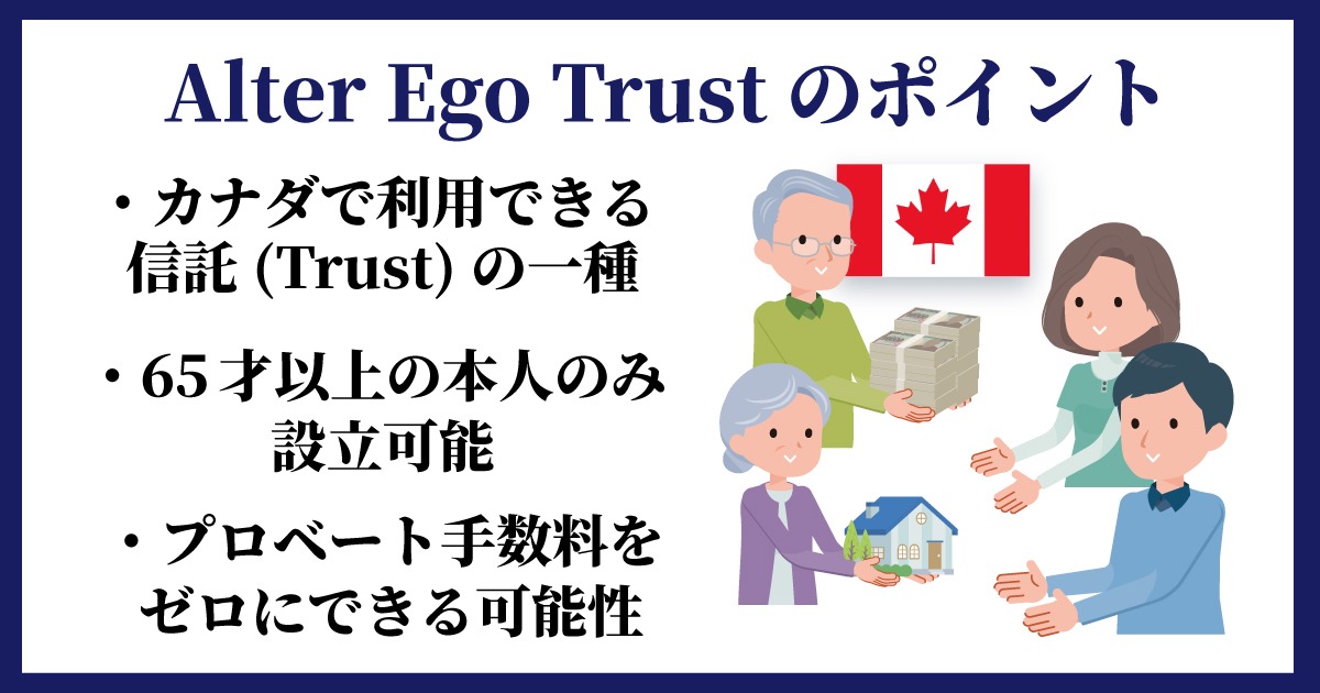 プロベート手数料(約1.4%)を回避するための対処として、カナダでは遺言以外にも 「Alter Ego Trust」 と呼ばれる制度があります。これはプロベートを通さずに資産を渡せる仕組みで、カナダの相続法の大きな利点だと思います。