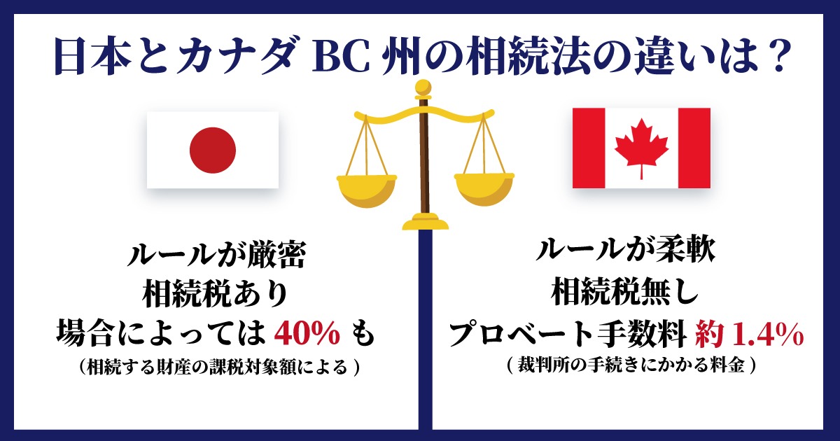 ただ、カナダでは遺産を相続する際に、裁判所の手続き(Probate)が必要になることが多いです。その際、BC州ではプロベート手数料が約1.4%ほどかかるのですが、日本の相続税に比べると大きな差があります。(※資産の規模にもよります)