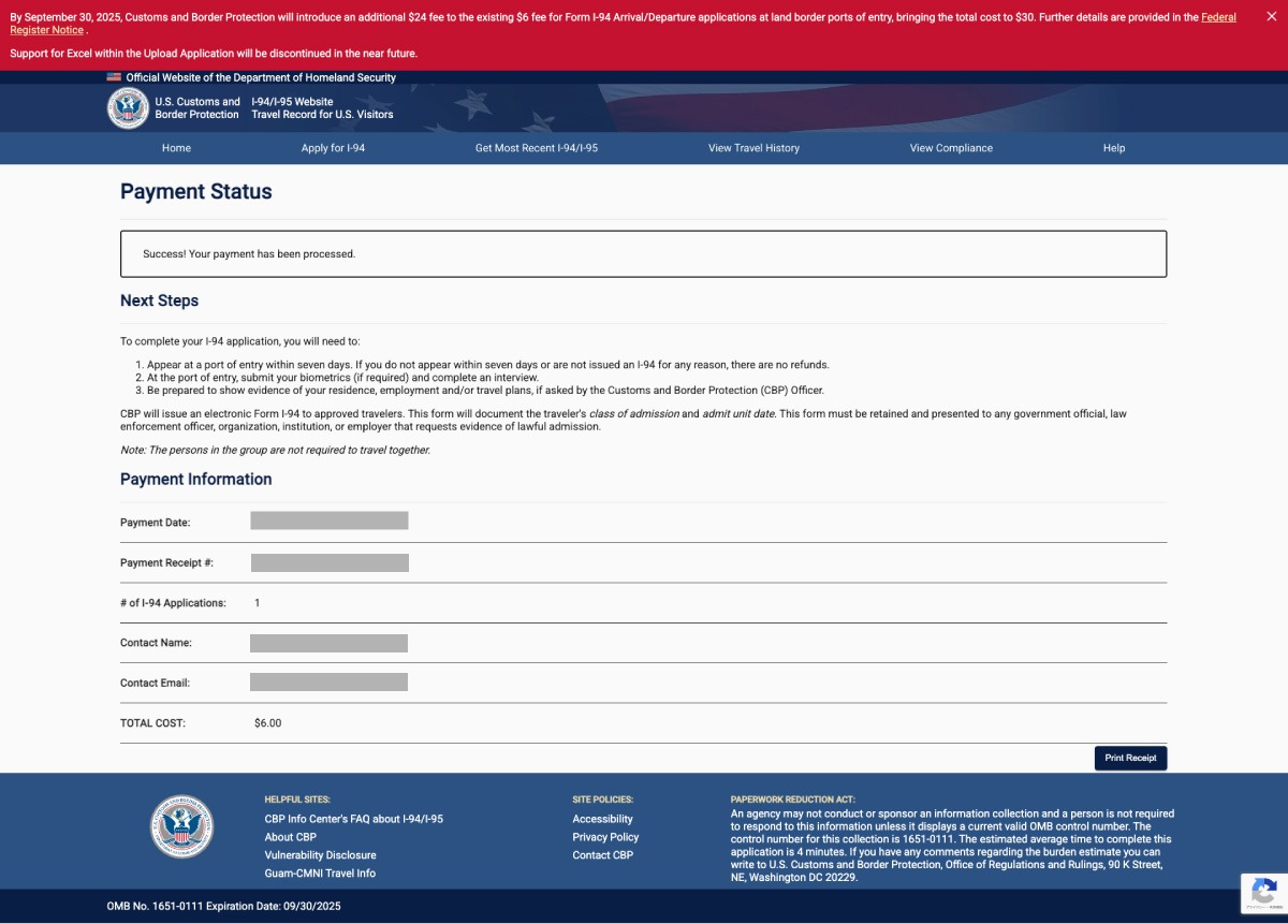 この時点では、まだ正式なI-94番号(入国記録)は発行されていません。I-94は、実際にアメリカの陸路国境で入国審査を受けた際に発行されるので、注意してくださいね。