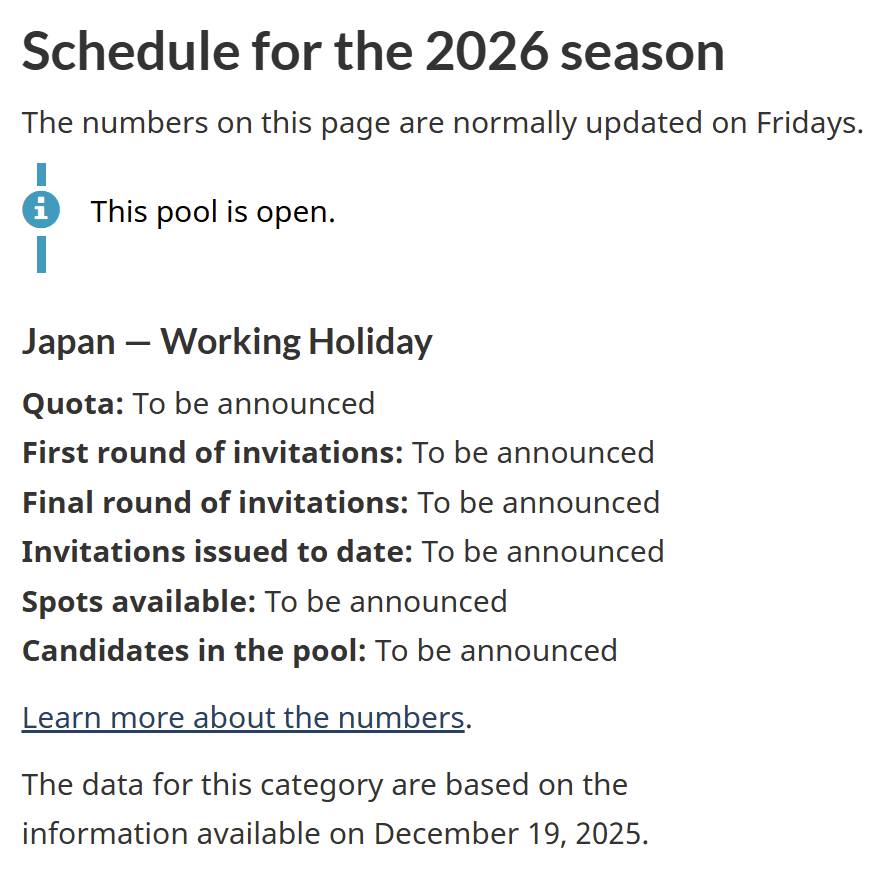 12月19日に2026年シーズンの日本の条件を見ると、まだほぼ何も分からない状態ですが、昨年と同様であれば、定員は6,500人になります。また、昨年は最初の抽選が1月下旬に予定されていました。