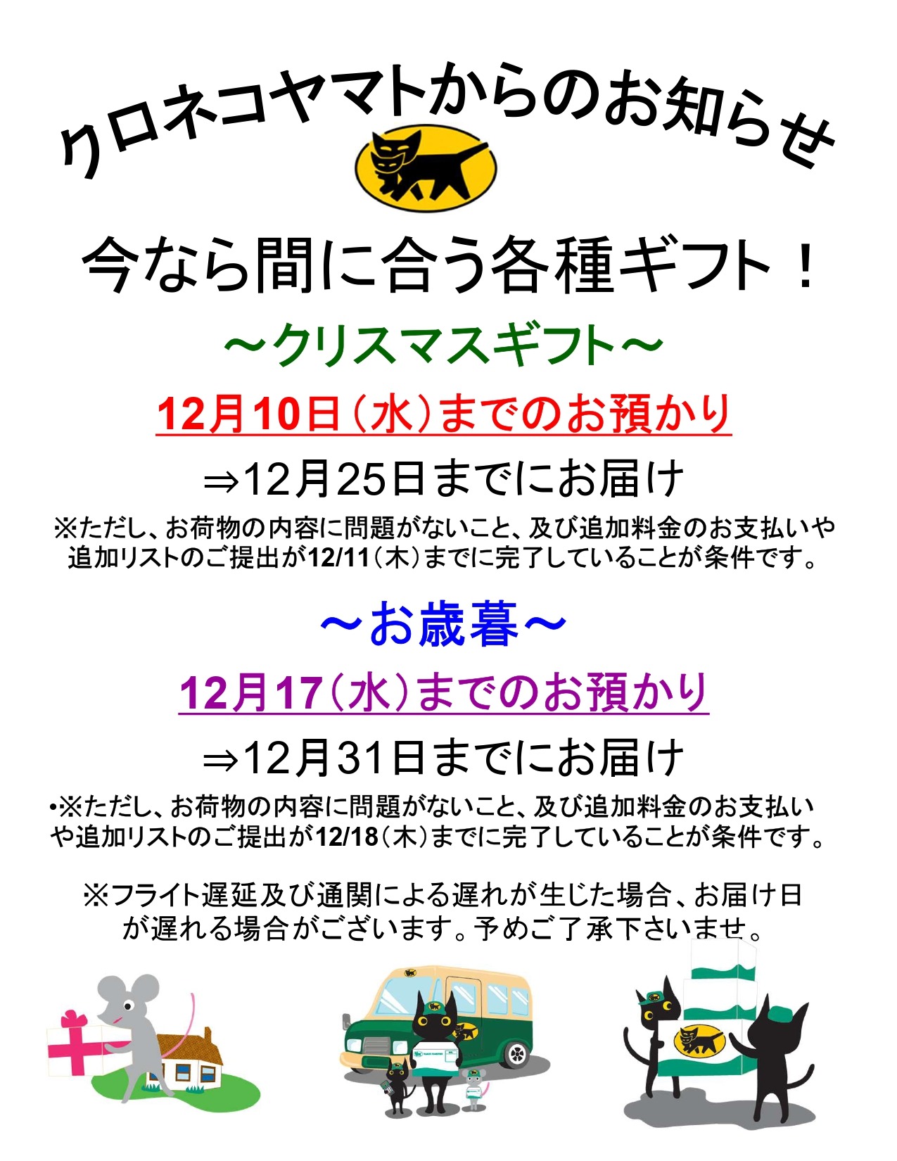 ※ただし、お荷物の中身に問題がないこと、及び追加料金などのお支払いや追加リストの提出が12月11日(木)に完了していることを条件とさせていただきます。
