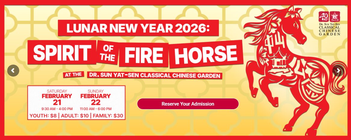 チャイナタウンにあるDr. Sun Yat-Sen Classical Chinese Gardenでは毎年旧正月イベントが開催されています。今年は「Lunar New Year 2026: Spirit of the Fire Horse」で、中国文化のライブパフォーマンス、茶会、家族向けワークショップなどが楽しめます。