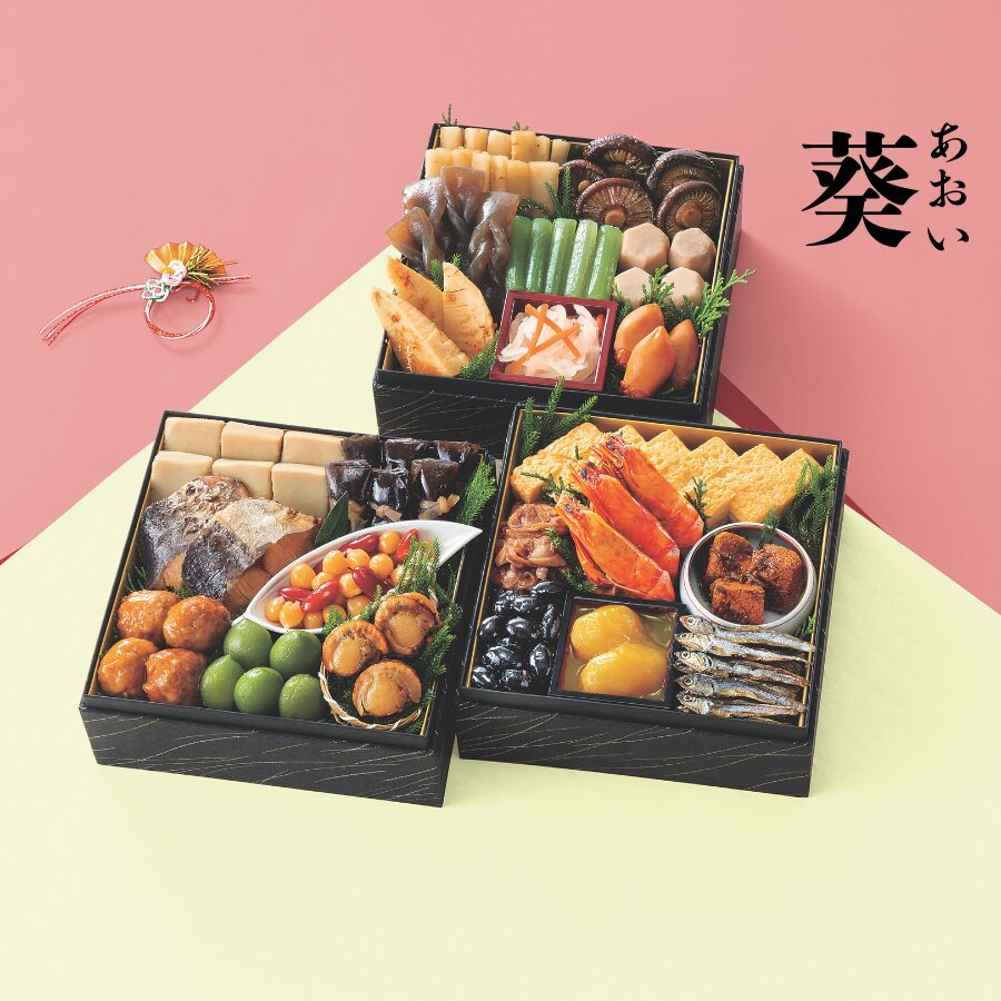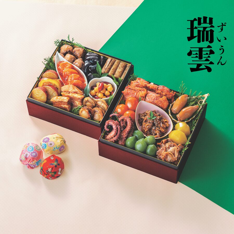田作り、丹波黒黒豆、ふきのうま煮、里芋含め煮、たたきごぼう、にしん一口巻昆布、松茸しぐれ、栗きんとん、味付しいたけ、穂先竹の子、なます、焼ほたて、子持ちいかのうま煮、鯛めしセット(焼鯛・鯛めしのだし)、だし巻、手綱こんにゃく、高野豆腐含め煮、祝海老、あさりのうま煮、白福豆、照焼つくね、ぜいたく煮