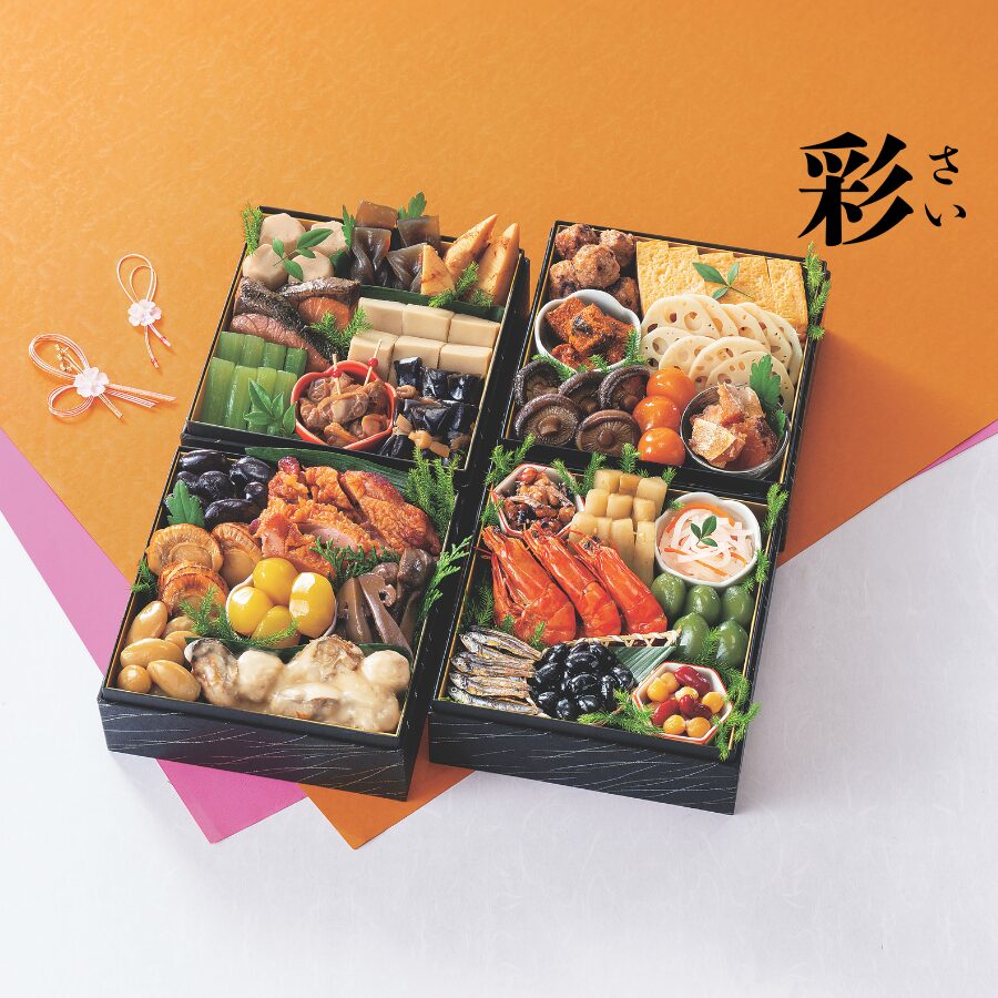 田作り、丹波黒黒豆、ふきのうま煮、里芋含め煮、富貴ごぼう、鱈のうま煮、一口巻昆布、栗きんとん、味付しいたけ、穂先竹の子、なます、酢れんこん、焼ほたて、やりいか姿煮、くるみ艶煮、鯛めしセット(焼鯛・鯛めしのだし)、だし巻、手綱こんにゃく、梅人参、高野豆腐含め煮、祝海老、イセエビの姿蒸(ミナミイセエビ使用)、あさりのうま煮、若桃甘露煮、紅白豆マリネ、白福豆、紫福豆(珈琲味)、牛肉ときのこの赤ワイン煮、照焼つくね、鶏の照焼、豚の角煮
