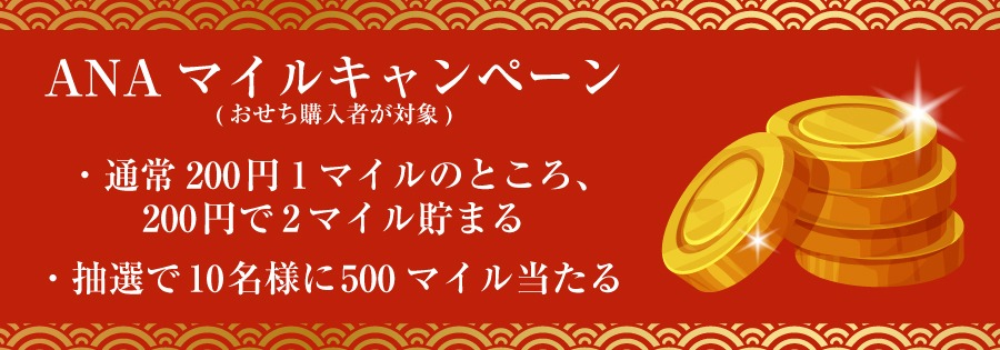 今回紹介しているおせちを購入すると、通常200円1マイルのところ、キャンペーンで200円2マイル貯まるので、よりお得です!ANAマイレージクラブに加入している人は、注文時に「ANAマイレージクラブお客様番号」欄の入力を忘れないようにしてください。