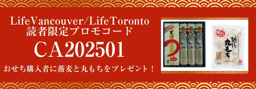 さらに、OCS に LifeVancouver / LifeToronto 読者の皆さんが使えるプロモコード「CA202501」も特別に用意してもらいました。おせち購入時にコードを入力すると、蕎麦と丸もちがもらえますよ!