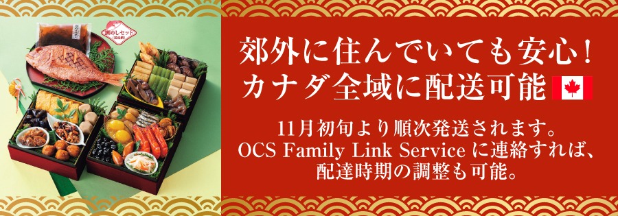 OCS Family Link Serviceが取り扱う倉敷鴨井本舗(カモ井食品)のおせちを購入すれば、自分で料理する必要も、おせちをお店までピックアップする必要もなく、日本でつくられたおせちをカナダにいながら気軽に楽しめます。