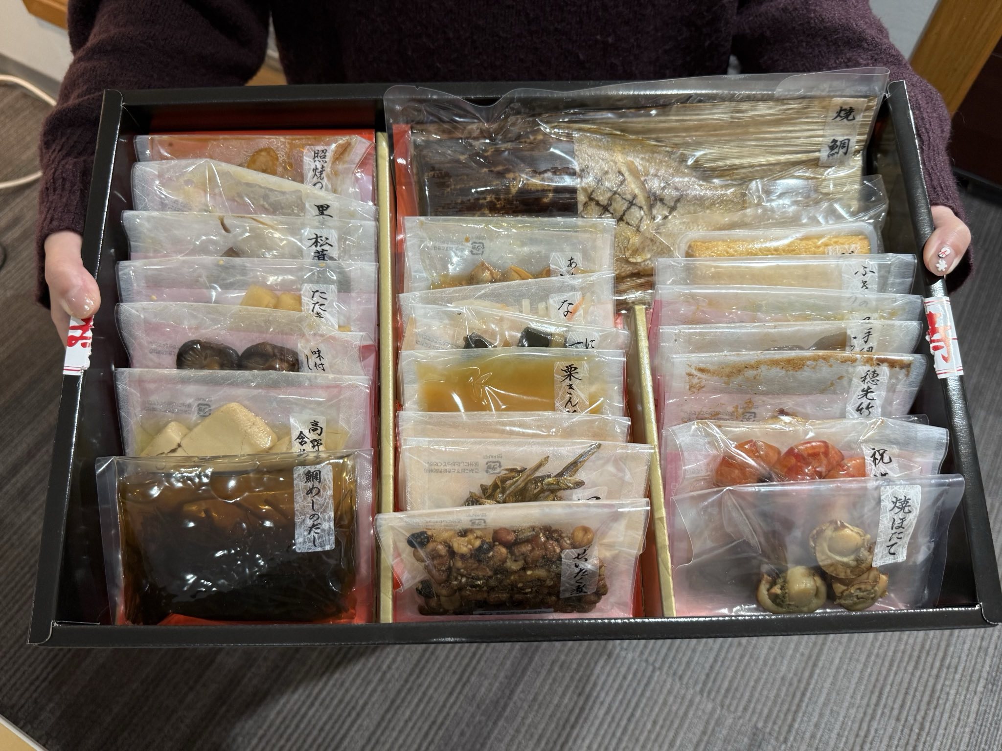 こちらがおせちです!全て個包装されています。見ているだけで、早く開けて食べたくなりました。
