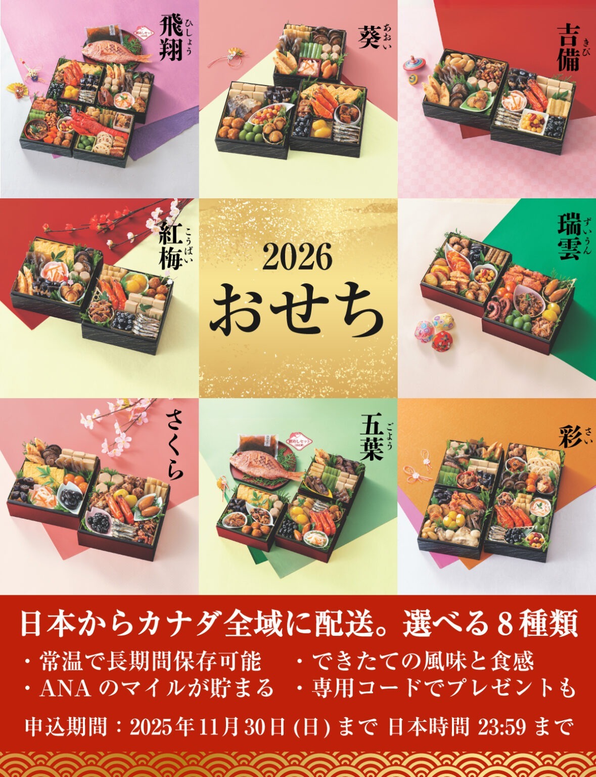こちらのおせちは、11月30日(日本時間)までに注文すれば、年末までに届きます! LifeVancouver / LifeToronto 読者の皆さんが使えるプロモコード「CA202501」を使えば、蕎麦と丸もちももらえるので、入力をお忘れなく!