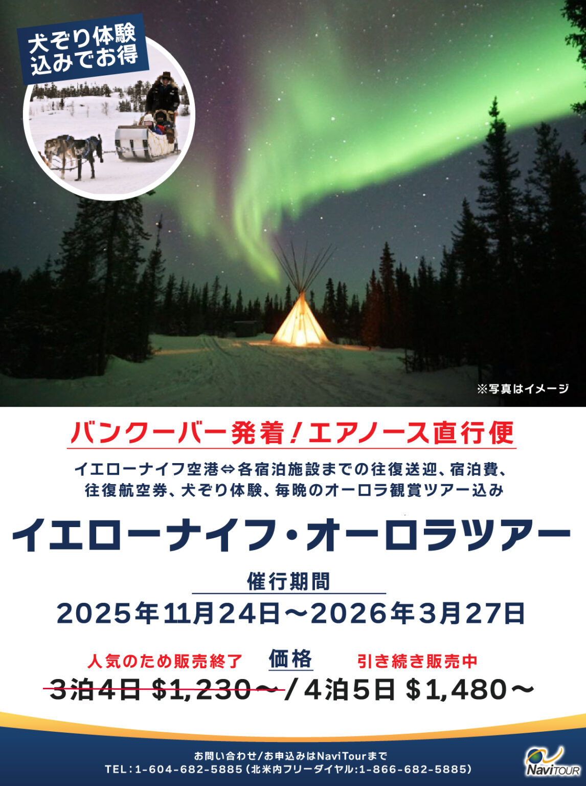 こちらは、エアノースのイエローナイフ行き再就航記念にてできた格安オーロラツアー。今回の就航は、まさに今だからこそ体験できる特別なチャンスで、来年以降も同じ路線が運航されるかどうかは未定のため、この機会にエアノースの直行便でイエローナイフを訪れる体験をぜひ楽しんでみてください。